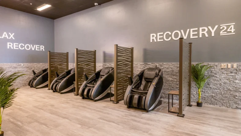 Now available at select clubs nationwide, Recovery24 gives members access to Hyperice Normatec compression therapy and Human Touch massage chairs in a spa-inspired setting, while Premium Fit24 offers