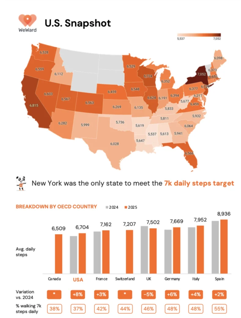Nearly two-thirds (63%) of Americans walk less than 7,000 steps a day, the report found, with women and young adults falling the furthest behind within the U.S. WeWard focused on 7,00 specifically, as researchers have observed clinically meaningful improvements in health outcomes when people hit that target.