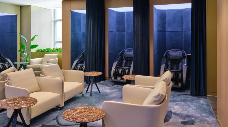 Cathay Pacific’s The Pier First-Class Lounge at the Hong Kong International Airport also ensconces travelers in luxury with a dedicated wellness area with day suites, massage services and shower rooms.