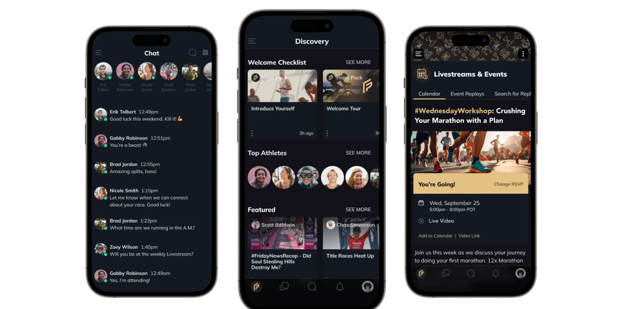 Front Pack’s initial launch includes features where users can connect with local athletes, chat via personalized feeds, advanced messaging and video, use AI to connect with professionals, build spaces for clubs and teams to communicate and coordinate, find livestream educational sessions, discover and RSVP to events, access exclusive deals from brands and retailers, compete in challenges and find local or virtual coaches.