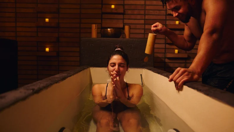 The experience ends with a communal cold plunge, where guests dip (two or four at a time) into baths cooled to 32–40°F.