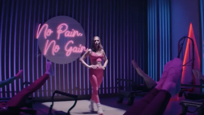 “What is this place? Why is it so dark? And what are these…machines?” the Pilates newbies ask as they enter a dimly lit room with Reformer machines, pink and purple ambient lighting, and ‘No Pain, No Gain’ written in LED lights. Wiig, dressed in two-piece pink activewear, greets them before she launches into overly complicated (yet comical) strap instructions.